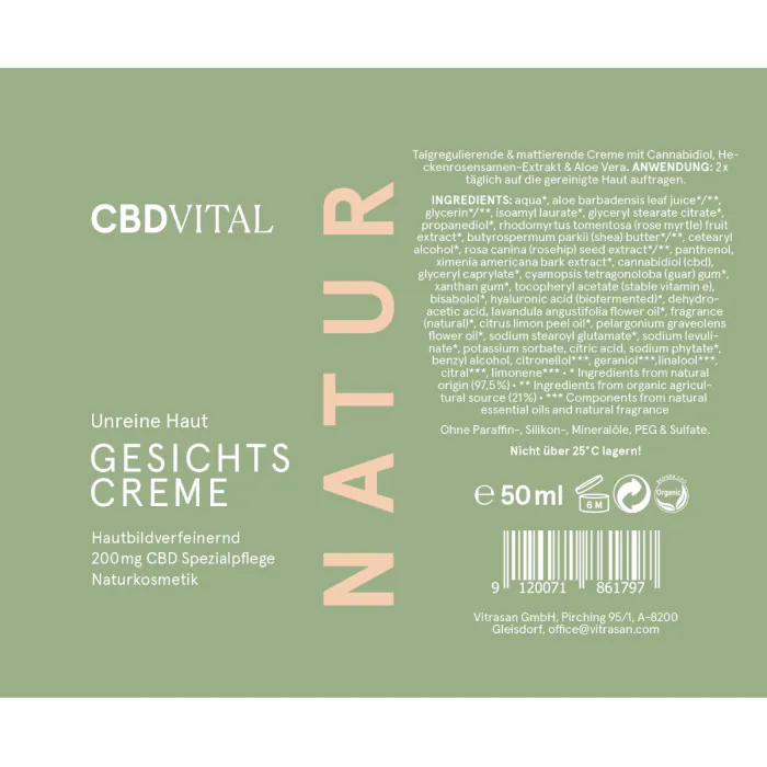 CBD VITAL Gesichtscreme bei unreiner Haut 2–3 Mal täglich oder bei Bedarf auftragen. Für Säuglinge und Kleinkinder nicht geeignet.